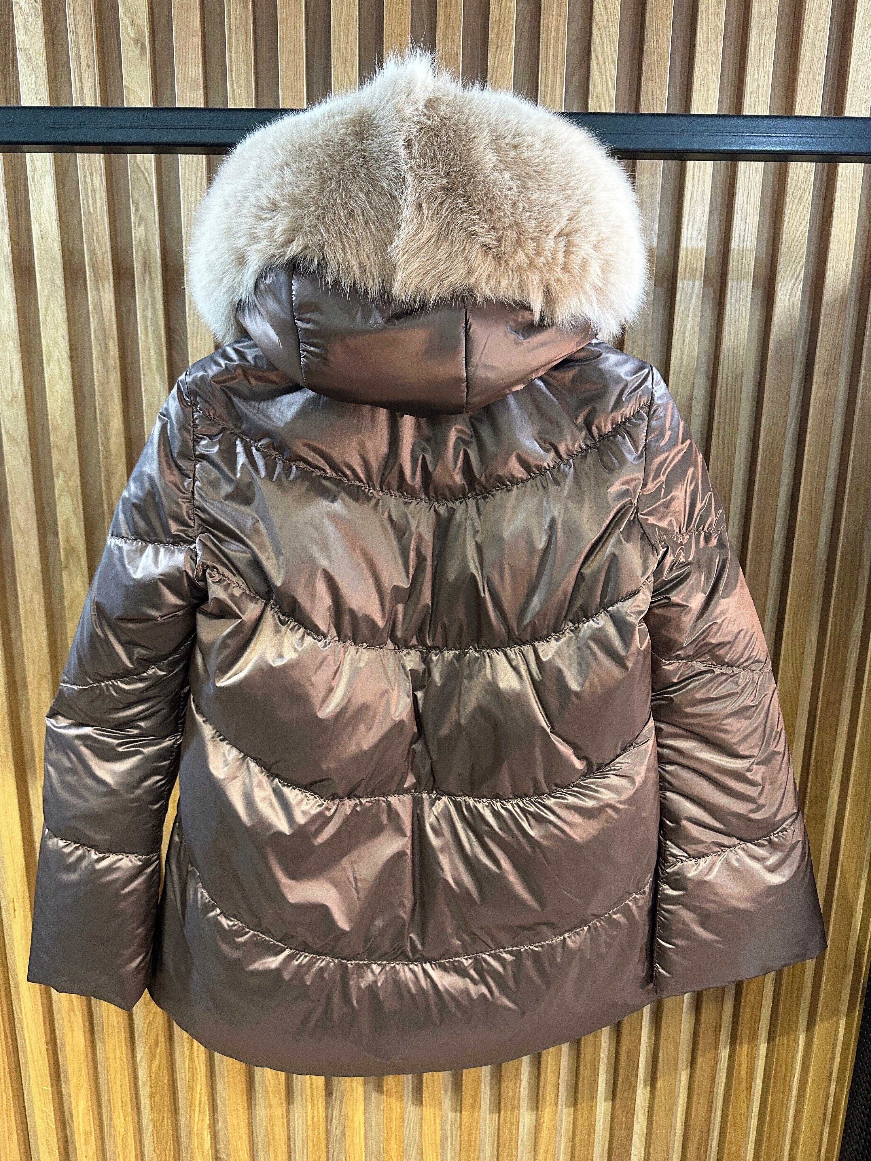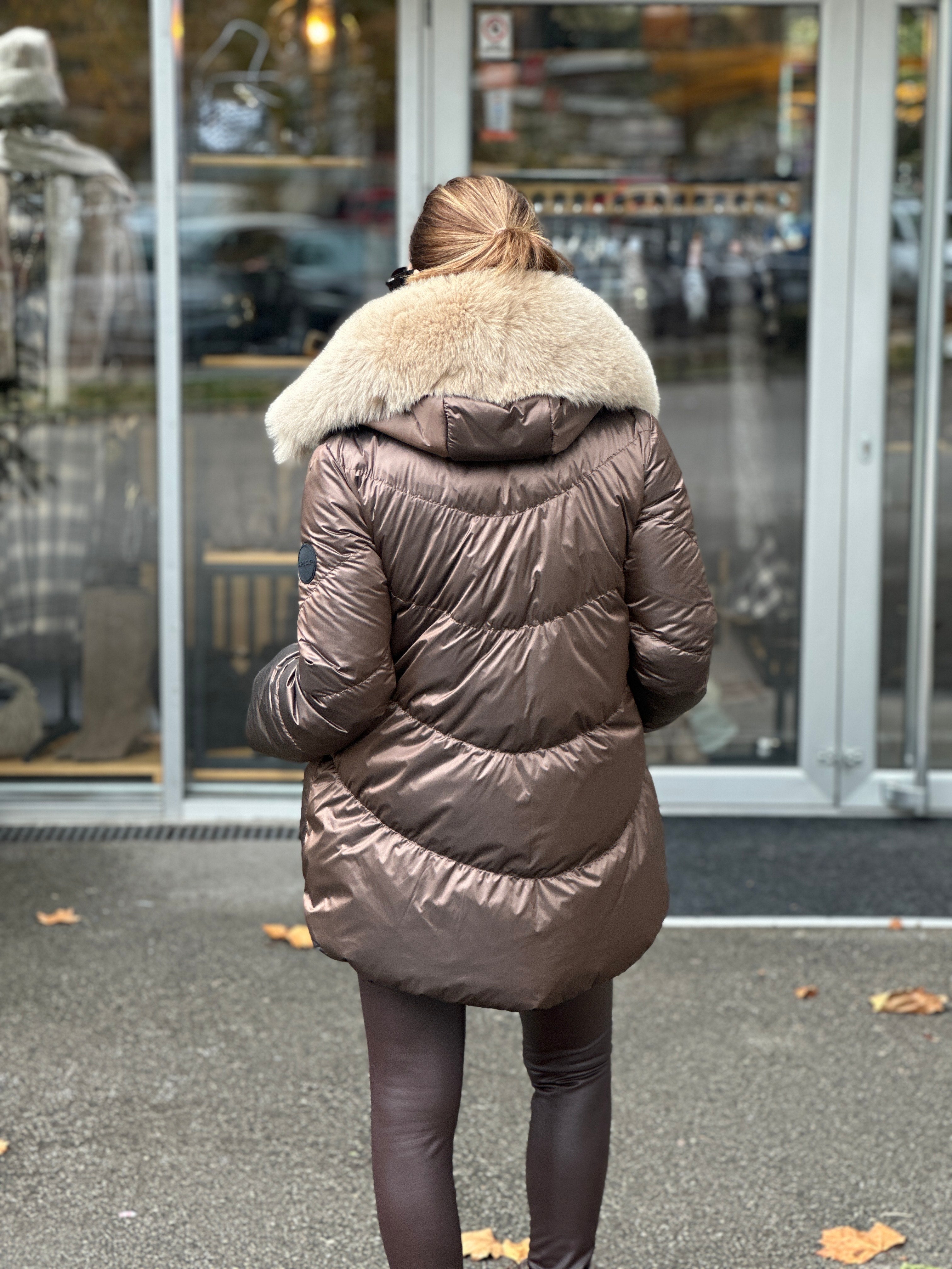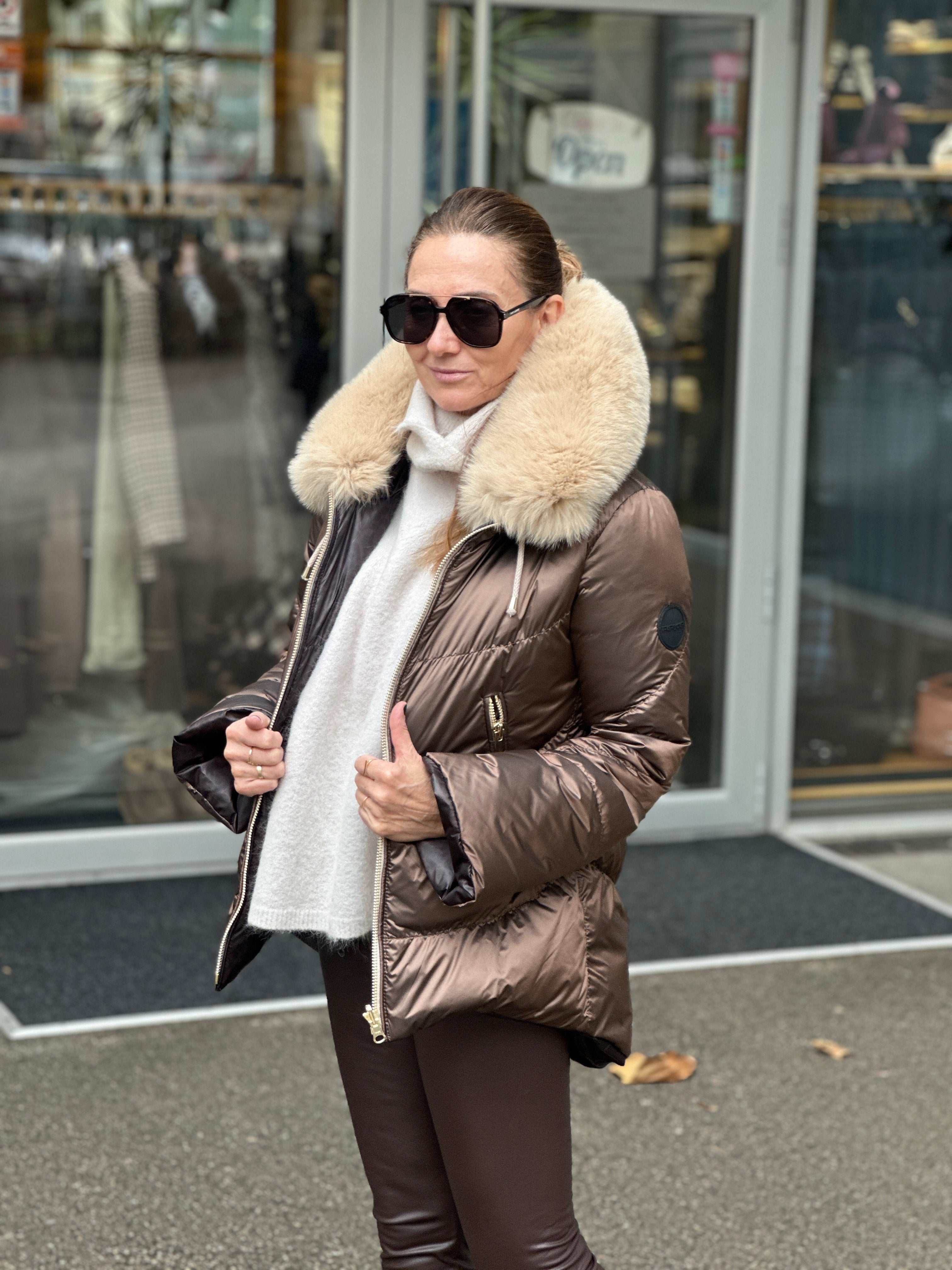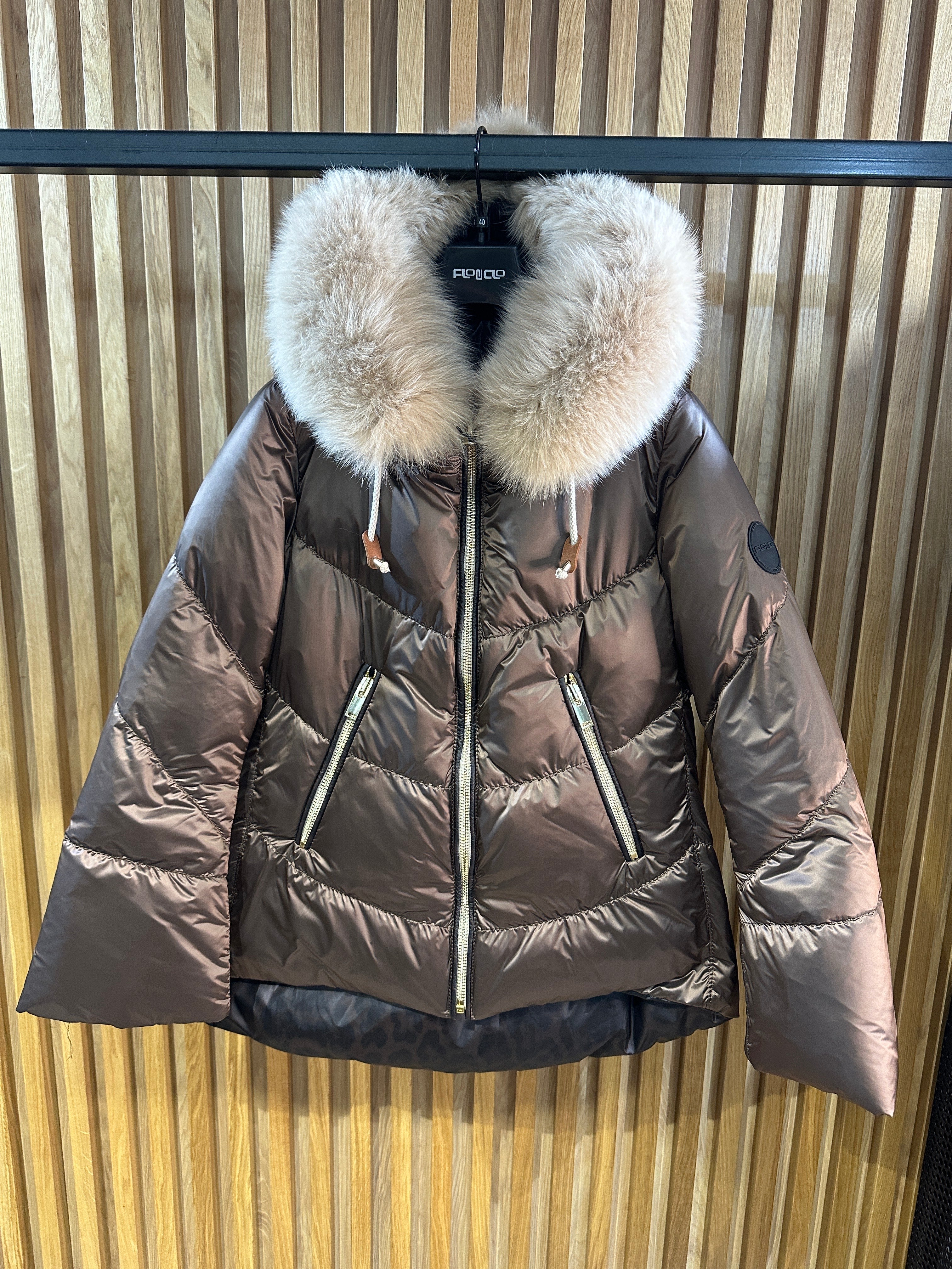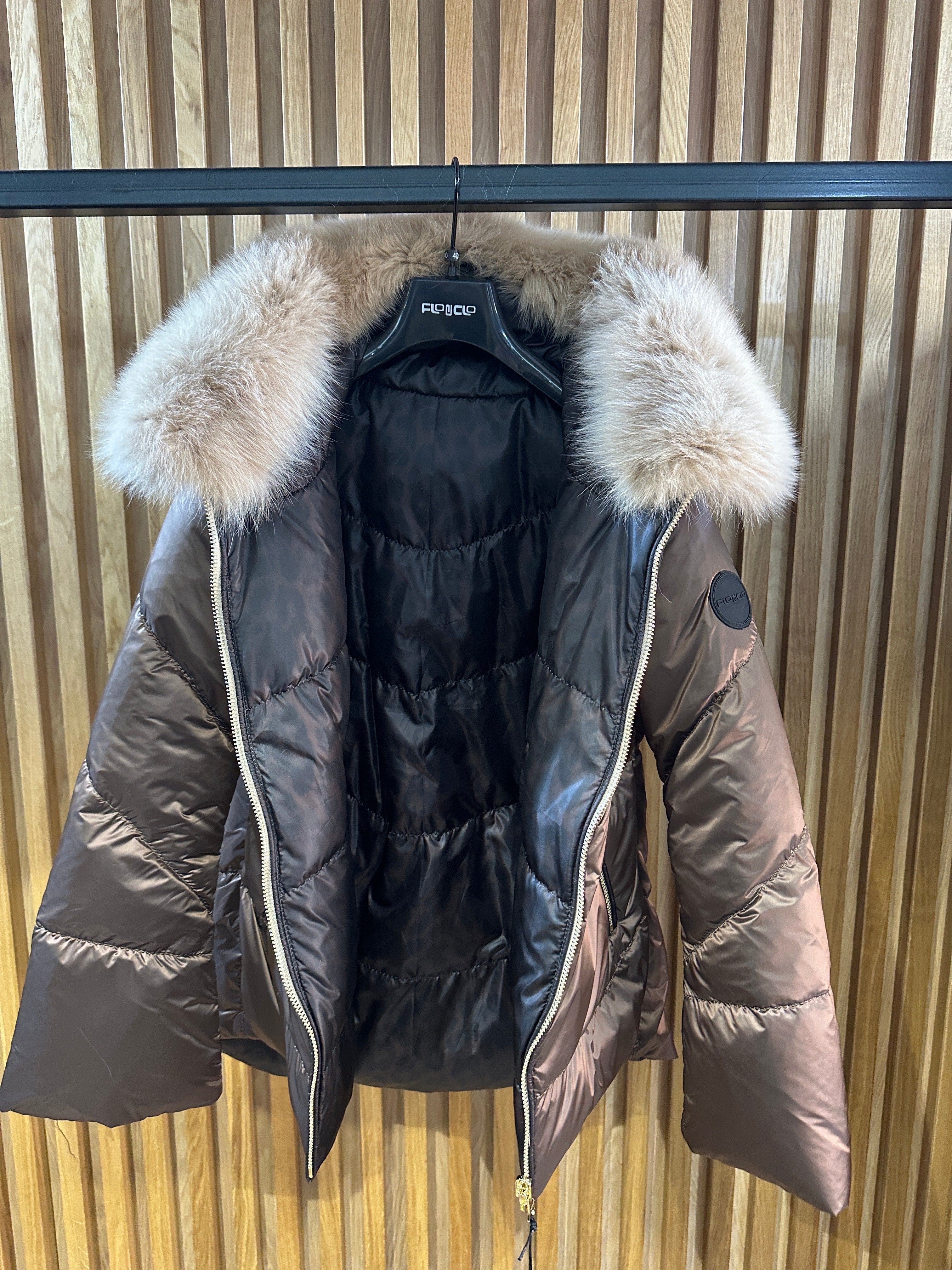 JAKNA SA PRIRODNIM KRZNOM SA DVA LICA PRVO LICE MOKA DRUGO LICE LEOPARDO POSTAVA POLIESTER PUNJENA GUŠČIJIM...